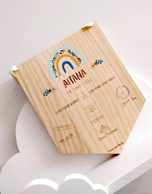 Banderín de madera pino-personalizada, ideal para celebrar y dar la bienvenida al mundo de ese pequeño gran amor.
